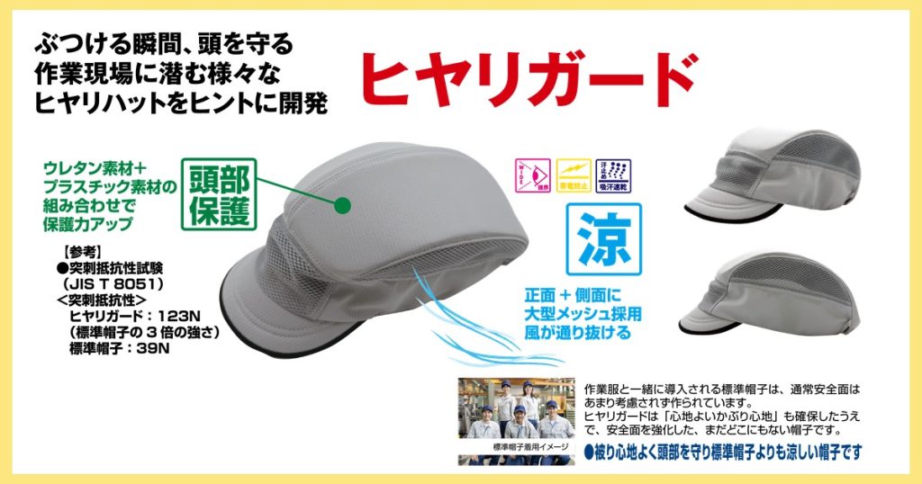 ヒヤリガードは「心地よいかぶり心地」も確保した上で、安全面を強化した帽子として私たちが開発した安全用作業帽子です。