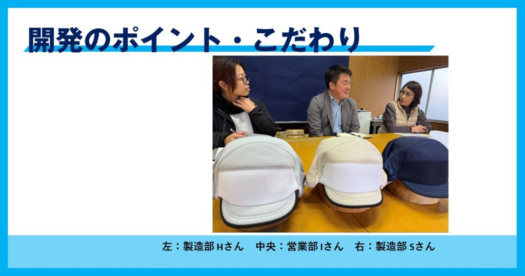 「Iさんからその話を聞いた時は、正直【そのような作業帽子、私たちに開発できるのだろうか】という不安はありました。しかし、お客様の課題(お悩み)は明確でしたので、そのひとつひとつをクリアしていく方向で開発をしていけば、ゴールにたどり着くのではと考えました。また、Iさんの熱い思いに協力したいと思いましたし、お客様の悩みの解決に貢献したいとも思い、製造部として開発に取り組むことにしました。」