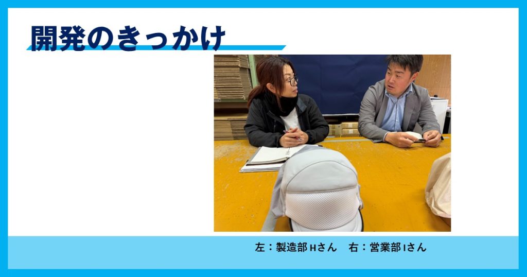 「大洞印刷株式会社様へ営業活動で訪問した際、今使っている作業帽子(他社様の商品)について、使用している方から困りごとの声が出ているとお聞きしたことがきっかけでした。」